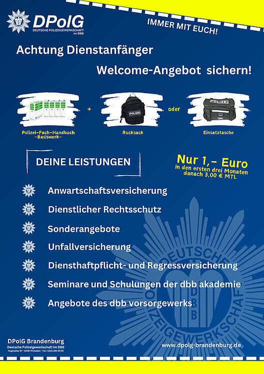 Bei Fragen rund um das Thema Ausbildung und Studium könnt ihr euch jederzeit an die Ansprechpartner der DPolG Brandenburg wenden. Die DPolG steht euch von Anfang an als Partner zur Seite.